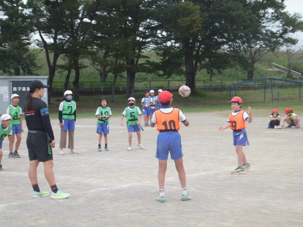 本日、熊谷市を本拠地に活動しているアルカス熊谷が来校し5年生を対象にタグラグビー教室が行われました。